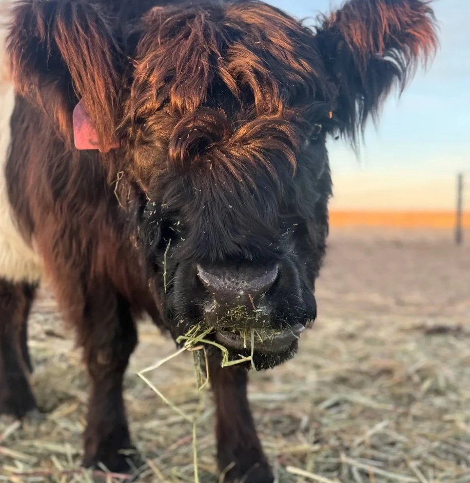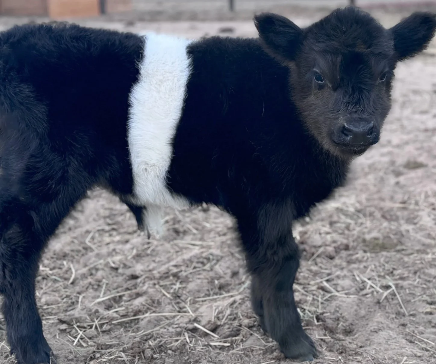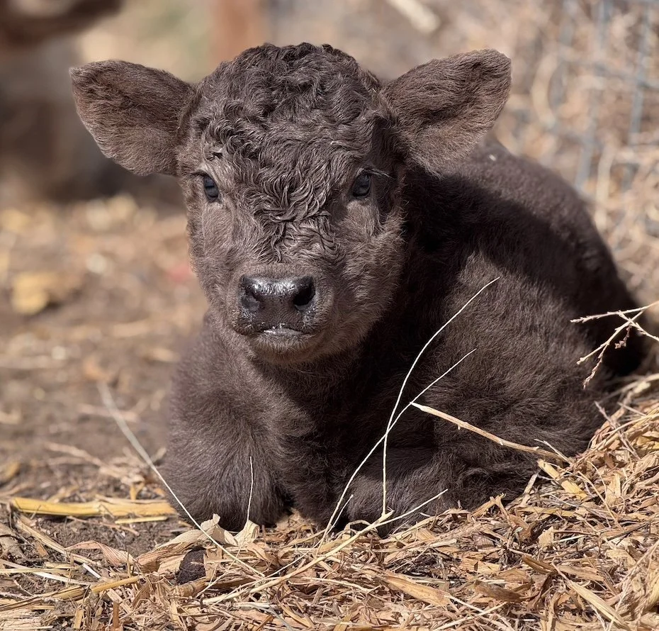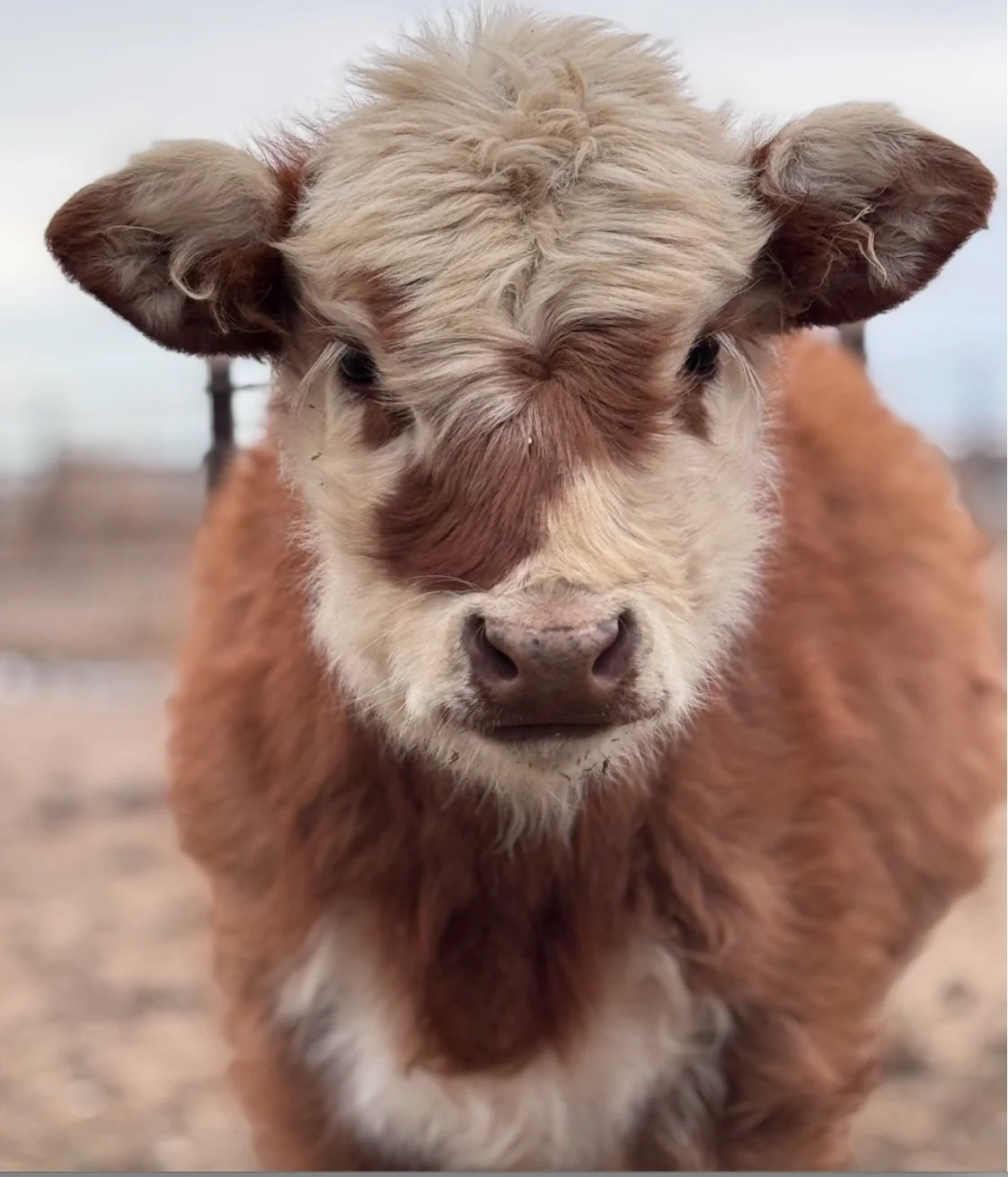 Millie born March 18,2025 100% Dun highland heifer calf. Millie should stay nice and small with mom coming in at 43” and dad coming in at 41.5” tall.